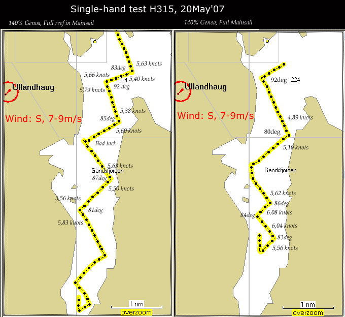 Today there was ideal conditions in the Gandsfjorden, so I did a test tacking against the wind to see what was the best performance I (with less than 2 years sailing experience) could get from my Hanse 315, sailing single-handed, with the 140% Genoa, and the Mainsail with either full or none reefing.