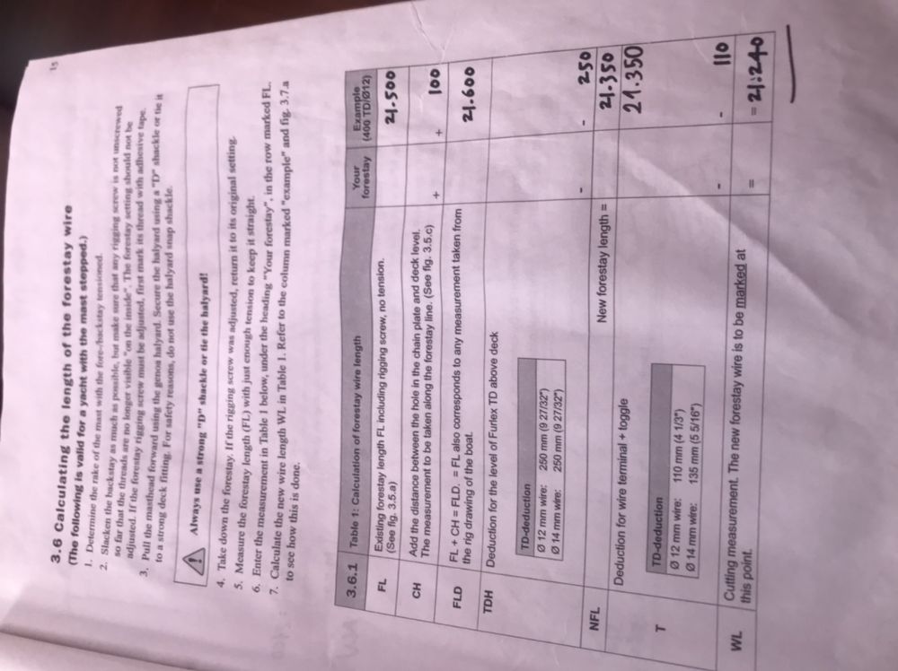 Look for the Selden Furlex 300TD manual online which contains text below. Also sailing 445 ZSPARS with decent amount of rake. Not sure how exactly you quantify it but from a distance in the marina, it clearly has more rake than our neighbours. We tend to sail short-handed and quite conservatively but not noticed any tendency to round-up unless pushed really really hard. Passage two days ago 8-9 knots in 20-25 knots on the beam with full sail which is pushing hard for us! Standing rigging 2-years old, sails new last year. Cheers. 14.1 To lengthen the forestay The forestay can be lengthened by fitting extra toggles, see table 3.3.3. Several toggles are usually required to change the mast rake noticeably.. These can only be fitted at the upper end of the system. On a Furlex with an 8mm (5/16”) forestay of the normal length 15400 mm (50’6”), the masthead is moved 158 mm (6 5/8”) aft if the forestay is lengthened using a standard toggle H=50 mm (2”). 14.2 To shorten the forestay. To shorten the Forlex system the forestay wire as well as the luff section have to be shortened. See Dismantling chapter 17 and Assembly of the Furlex system , chapter 4 Edited by Ian Coverdale - 15 May 2025 at 07:17 |