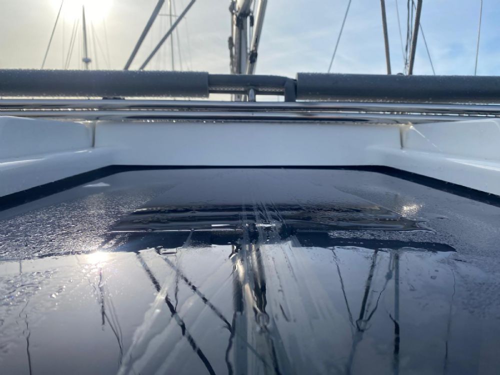 You should see the screws of the fiberglass base where the hatch slides in. Undo them all, lift the base and remove the hatch. You may also need to remove the rail of the sprayhood if you have one.
