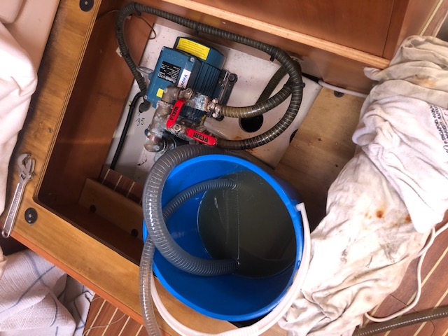 I *ALWAYS* do it with the boat in the water. That's what the hoses were for. To disconnect the hose coming from the seacock (in and out) and have it come from/to a bucket. Making the hoses makes the job easier every fall for winter layup. FWIW |