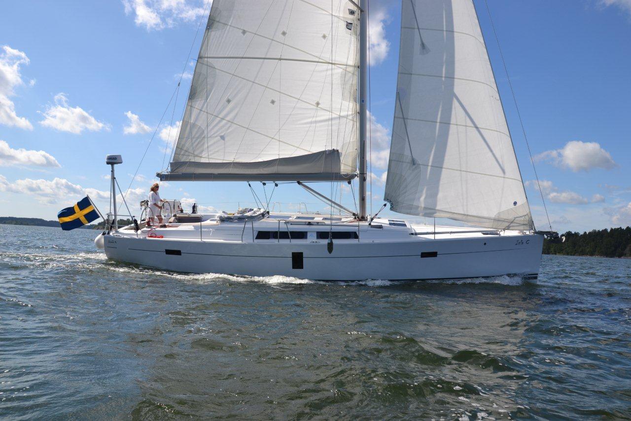 The 445 is an absolutely fantastic boat!  I've just started chartering her out, http://silverfin-charters.com/spain/balearic-islands/port-de-soller/disco-biscuit-hanse-445-183347 , having sailed the thing from the Hamble to Gibraltar last April.  Really effortless sailing, a few bumpy spots during the trip and sailing through fishing areas, in fog, at night and without radar is exciting to say the least!