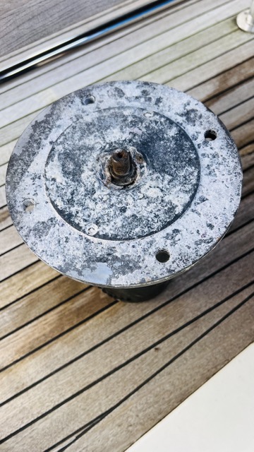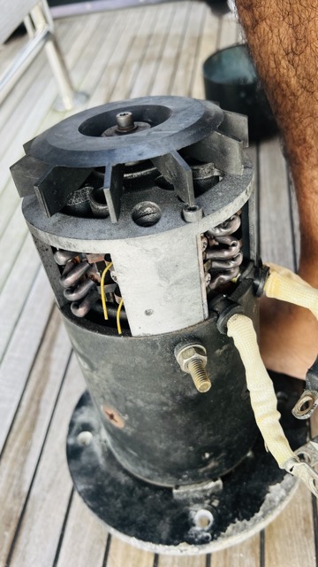 To my untrained eye, the flange looks pretty bad. I'd guess the motor shaft is corroded tight. I couldn't turn it by hand. I'd guess that a good motor mechanic may be able to fix it by replacing bearing etc. But can't be sure unless I get it done. And a bowthruster being generally needed only when things get hairy, I'm not sure I'd be comfortable with that kind of fix.