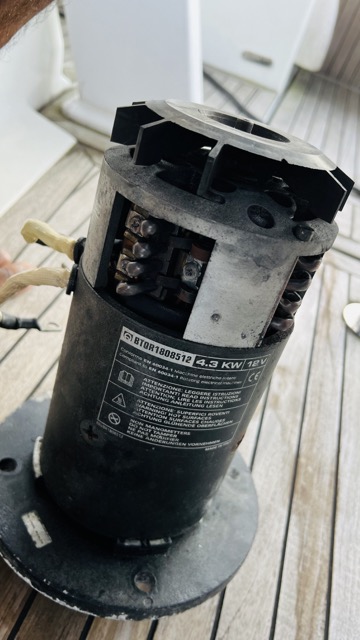 I notice corrosion on the motor flange. Is the boat in the water now? You may have a leak in the shaft seal of the thruster bearing. That type of leak can find it’s way into the motor. 12 volts will spin the motor but secure it well…it packs a punch.