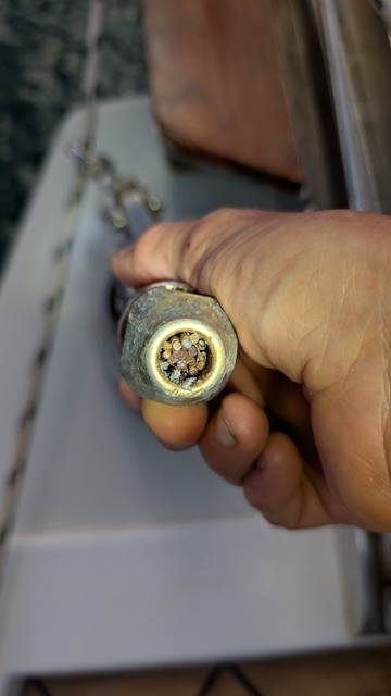 Thanks for the sympathies! We haven’t had any changes made to the head stay or the rigging more generally since buying the boat three years ago. We had a rigging inspection done by our home yard in October before heading down to the Caribbean and they didn’t flag anything. Attached you’ll see what remains of the head stay within the sta-lok fitting. The inner core looks pretty corroded. It definitely has me inclined to replace the setup with one that uses a full swage fitting. ![]() |