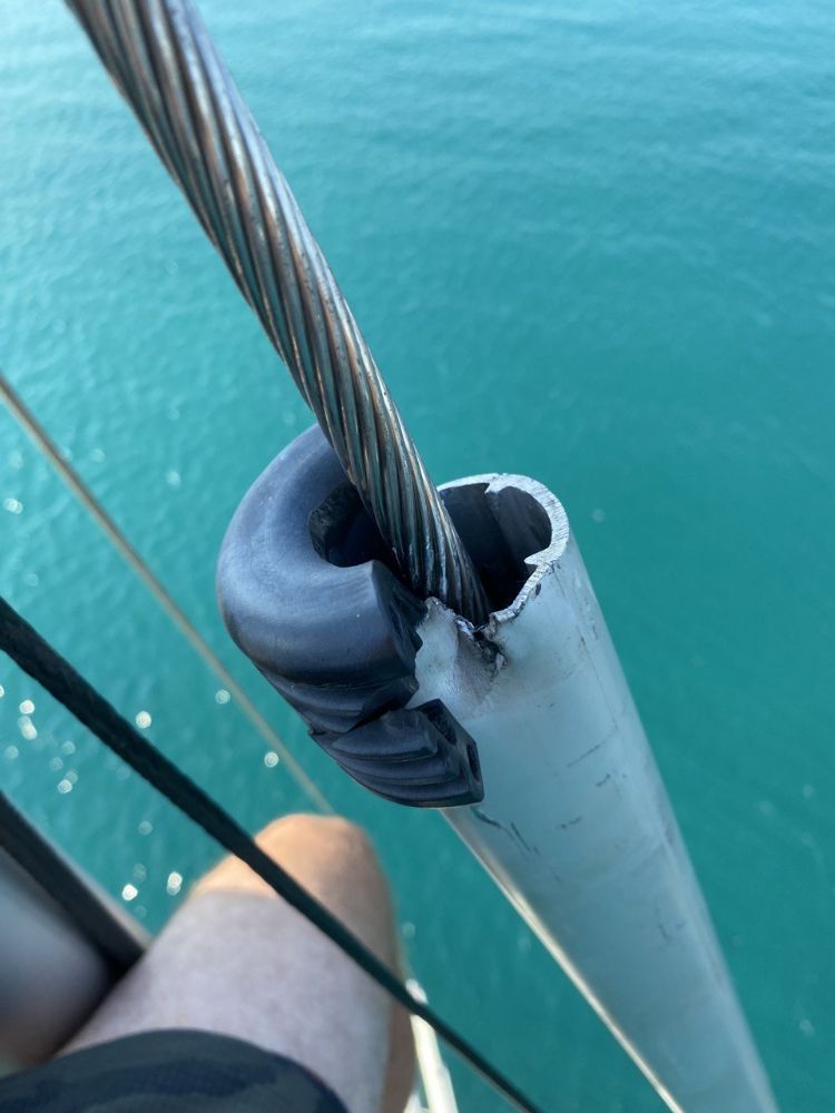Mainer, have you reached out to Sta-Lok or Selden (reseller) about the mode of failure? Your photo may indicate evidence of some kind. I’m no expert but it looks like the fitting did not fail but rather the wire itself. I’m wondering if the below deck installation of the furler accelerated corrosion.