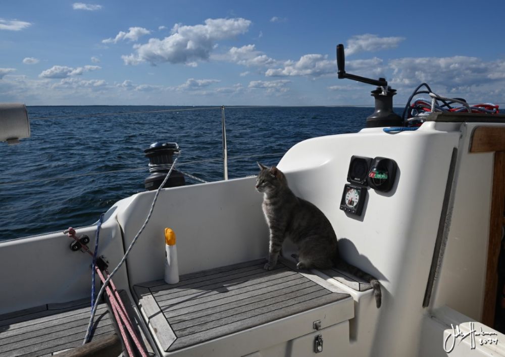 I just realised that since I got to Kalmar I have been sailing on my own with the two cats as my only company. I cannot remember the last time I spent that amount of time sailing single-handed but it sure is more than a decade ago. It has however been a good experience and I have had to brush up my skills on handling the boat alone. It also reminds me how easy handling the 342 is when you have the right setup. Main and jib sheets in the cockpit is just one example of what makes handling easy.