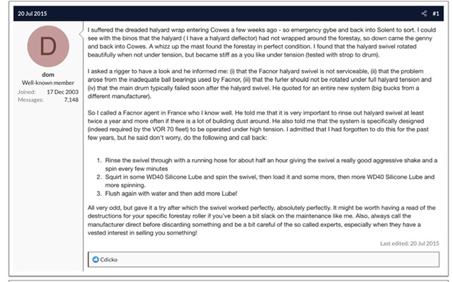What I read is that the facnor is actually designed to perform and spin under (high) load. Same with the rinsing procedure, it says ‘load’. It may just be my swivel, but I find it easier to spin under load than without. I tried that by bringing the swivel down, tying it off and tension the halyard again. That’s also how I did the rinsing and WD40 flush. Anyways, not everyone is experiencing the same I guess, but in my case The 17 year old swivel is doing fine (again)