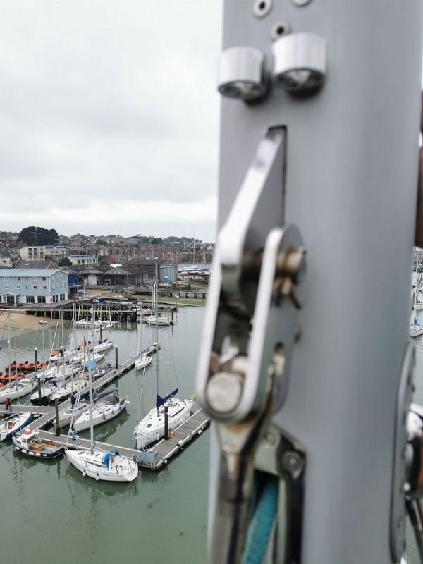 This as you imagine still carried some weight and so the pin didn't come out without a fight and being this high up I didn't want to watch the splash beneath as my efforts exceeded the force required to remove it. I retained the pin and the forestay dropped about 50-60mm as the weight was taken up with the halyard.