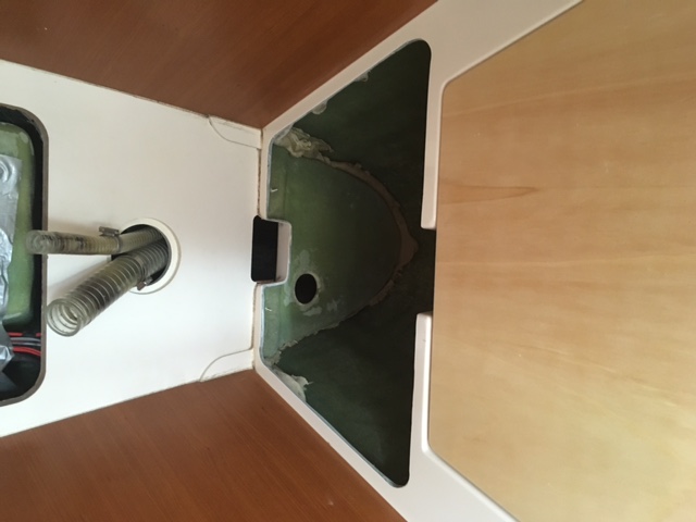The approach I used was to, with a small saw, reach in between the inside shell covering the anchor well in the forward cabin and cut down the bulk head to follow the shape of the inside shell (or 1/2" inside of the shell perimeter if you saw under an angle).  There is about a 1" gap in my case between he inside shell and the forward bulk head.   I believe this is standard on my vintage boats since I have seen it on other 415 and 385s as well.  Once the bulkhead is following the inside shell's edge, you can reach through the inside inspection hedge (see S&Js picture) and get to the bolt.  Not easy but if you use a ratcheting wrench pretty doable.   Cutting the bulk head down to be slightly inside the inside shell's perimeter makes it is not visible from the cabin/bed and there is no need to cut a hedge in the anchor locker (avoiding possible leaks).