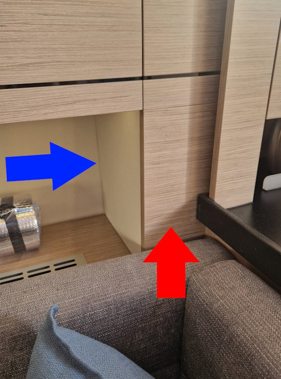 I've seen the Hanse Stock photos show a speaker install in the panel marked with the blue arrow.  This is covered in a type of fabric so the plunger for panel removal doesn't hold vacuum to allow its removal that way.  It seems really secure there.  Similarly the panel marked with a red arrow is equally secure (and has a trim strip from the galley in front of it).  The magic question is therefore - how do I get into the space behind the blue arrow panel to see whether there are any pre-machined speaker positions (as there are on the port side locker)