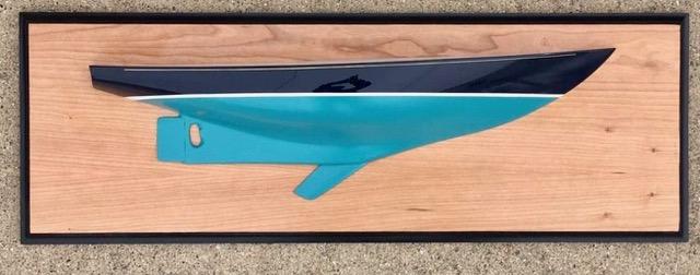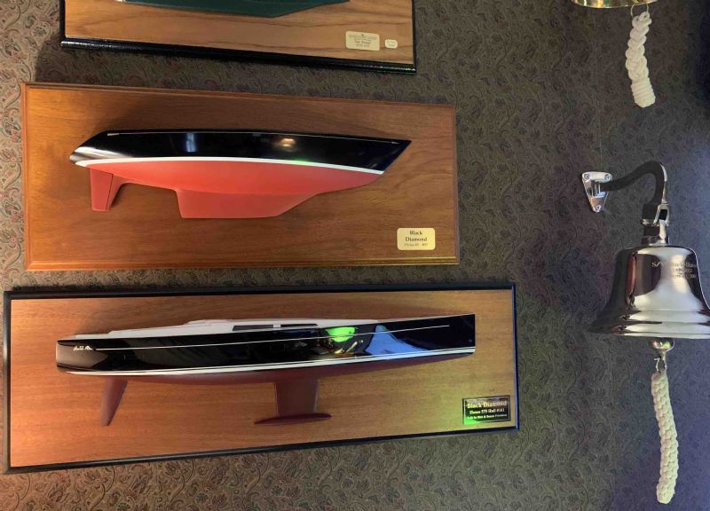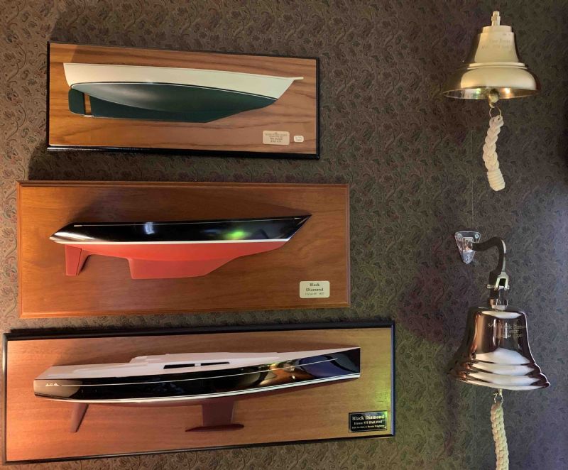 These are Fraley half hulls. When ever we get a new boat (every 10 years or so) we have the bell engraved and the half hull made. Our Hanse 575 is at bottom. Its bell is on the boat (as required). The bells from the old boats go on the wall after we sell the boat. FWIW ![]() |