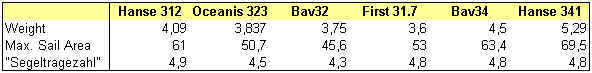 If you compare a Hanse 312 with the Oceanis 323 or a Bav 32 you have to take the maximum sail area. With the Hanse you can carry a regular Genua 1 with about 33sqm. Regards Thomas. |