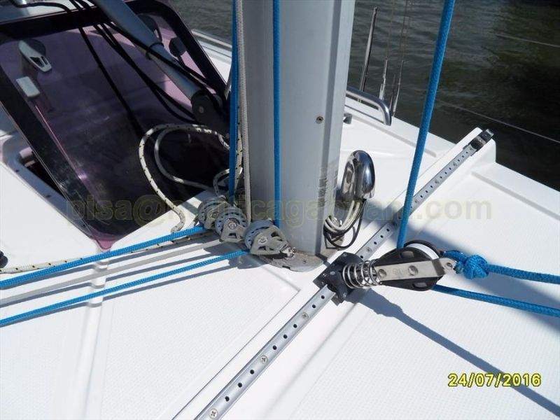 I am due to receive my new 348 this May and am trying to figure out a simple system for heaving-to, what with the self tacking jib making it impossible as-is. Would stanchion mounted cleats with simple short line from the jib clew be too much pressure on the stanchion? Anyone have suggestions? What works and what doesn't? Always appreciate your wisdom and experience! Thanks