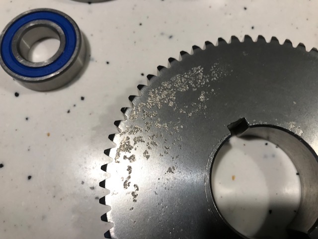 External there was nothing obvious except for a few areas of corrosion. When I got it home I started dismantling it, this resulted in 4 of the M6 Allen assembly bolts rounding the internal hex and having to drill the heads off them. Interestingly it wasn’t the threads of the bolts that were seized but the heads in there recess holes. To reparation the assembly plates I used a sharp fine edged knife to get the initial casing separation. Once having this I used alloy casing separation wedges to fully part the outer casings. Immediately on opening the DD1 it was obvious that the failure was caused by water ingress. Initially blaming the oil seal on the output shaft for this due to the delamination of the rubber seal material from the seal’s metal frame. On close examination of the shaft there was no evidence of wear or corrosion below the seal’s lip line. So despite looking appalling it was still doing its job. Bearings and gears were all badly corroded, so I decided to vapour blast (same as aqua blasting) all the components as this would be the only way that the corrosion products could be reliably removed from within the corrosion pits in them. Trying to clean by wire brush or lightly sanding will not remove all the corrosion deposits and then on assembly, rust will contaminate the lubricating grease causing more problems down the line.