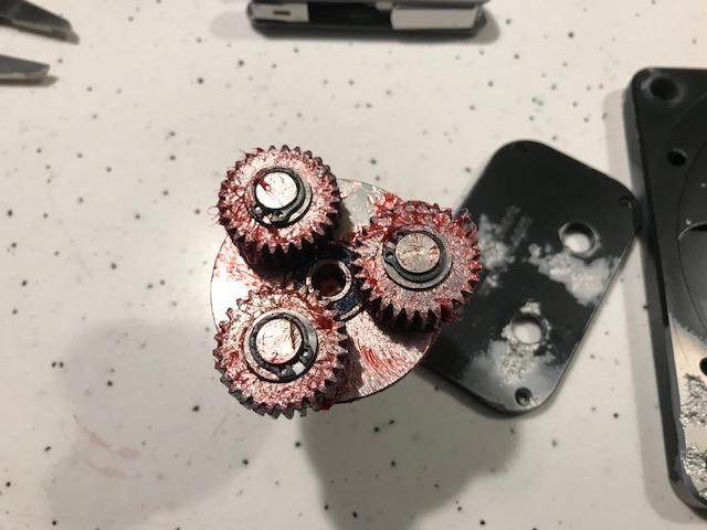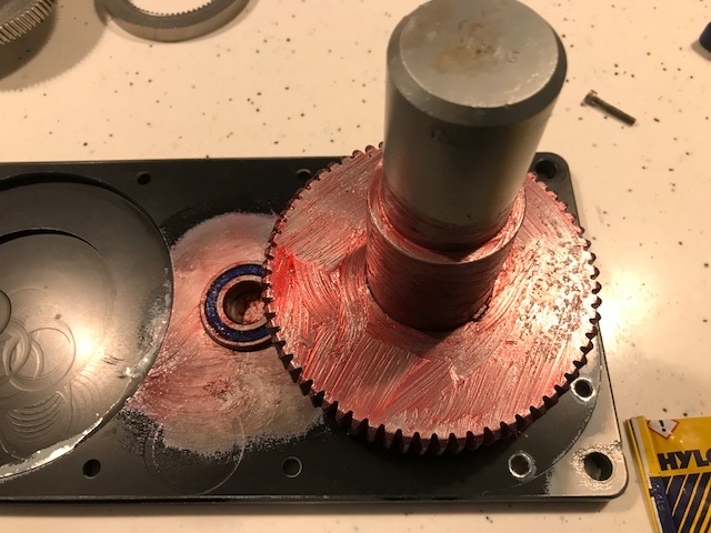 In addition to replacing the drive motor I also replaced the clutch solenoids. They are a pain to replace the new ones arrive just as two separate coils, dogs to engage the clutch and magnets that the coils interact with to operate. Once you’ve drilled the plastic plugs with a 3mm you screw a self tapper in and pull them out. This gives you access to the clutch coils, dogs and magnets. You have to wire the new coils in series to match the originals giving a positive and negative fed wire. Once done fit them into the casing put the dogs and magnets in and gently tap the plastic plugs back in. Now test the clutch using a 12v power supply or battery, if the clutch dogs don’t shoot up through the casing remove the plastic plug on the offending dog and turn the magnet over through 180 degrees. Reassemble and test, both clutch dogs should now shoot up when power is applied. Place your new bearings into the casings, grease all the gears by using a paint brush to apply the grease in a layer that is no more than 2mm thick anywhere. That is plenty of grease to lubricant for life. Place the sealant on the casing faces ensuring that it won’t fowl any moving parts (gear wheel that runs directly in the casing and the clutch dogs lock into) and assemble. I used a synthetic grease as it has greater life and is more water resistant.