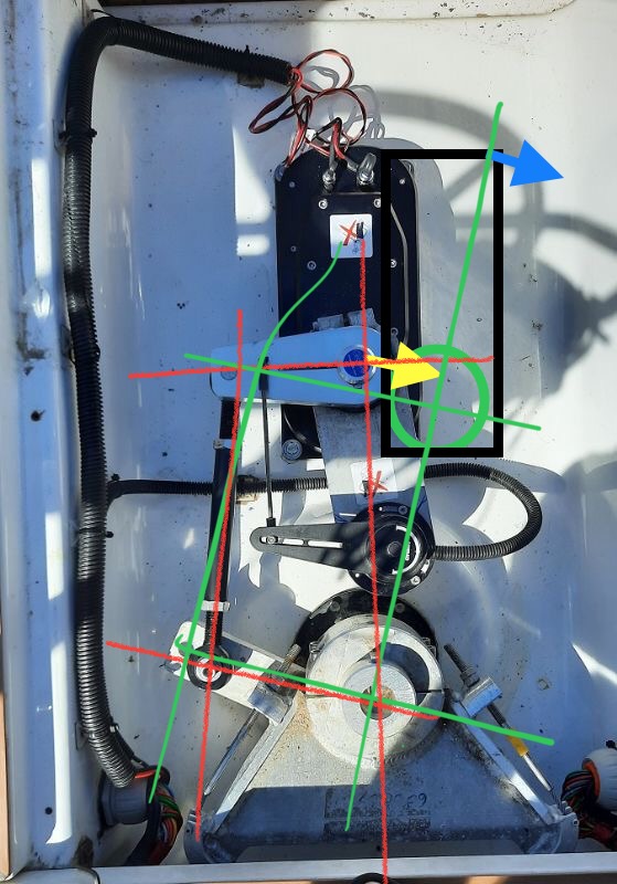 you are absolutely right. If you can change the position of the drive unit so that the center of the drive shaft switch to the green lines crossing point, the angles between rudder tiller- draglink and drive tiller-draglink will be both 90 degrees and both tillerarms will be parallel to eachother the yellow arrow is the offset like in de Jefa instructions.Only adjusting the length of the draglink you can never achieve this