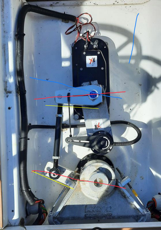If you look at the RED lines in the installation that was posted, you will see the they are not parallel. This is not a correct set up. The pilot arm needs to align with the BLUE line. This can be done by lengthening the drag link by about 50mm. Once that is done, the sensor bracket needs to swivel clockwise so that it 90:degrees to the pilot arm. Otherwise it will have different readings from port to starboard. Also note the yellow lines that were previously drawn are not relevant to an installation. All lines need to pass through the two axis they represent.