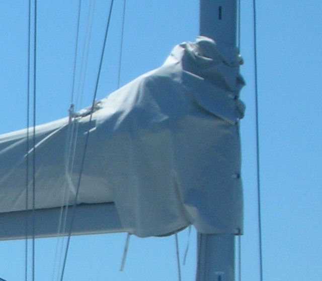 Does everyone loosen the tension after the sail is dropped and then add the "bra"? That seems like more work than should be required. Next Spring, I will upgrade the small blocks on the upper speader that are used for the lazy jack lines and I may add a small block on my mast just above the height of the sail drop. Then the 1st line will be close enough to the mast (even when under tension) that I can install the "bra." Any other suggestions would be appreciated. |