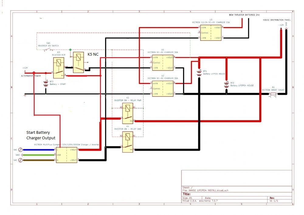 Here's the original wiring currently in the boat. The inverter/charger is already connected to the alternator & start battery through the ACR. So not sure what changes when I put the LiFePo4 batteries in with the chargers. When in "inverter" mode, the setup is effectively the same, because the DC-DC chargers are disconnected and the large contactors connect the inverter directly through the batteries. The Alternator/Start battery/ACR connections remain the same, and it currently works correctly (this was the original layout from HANSE... Am I missing something?