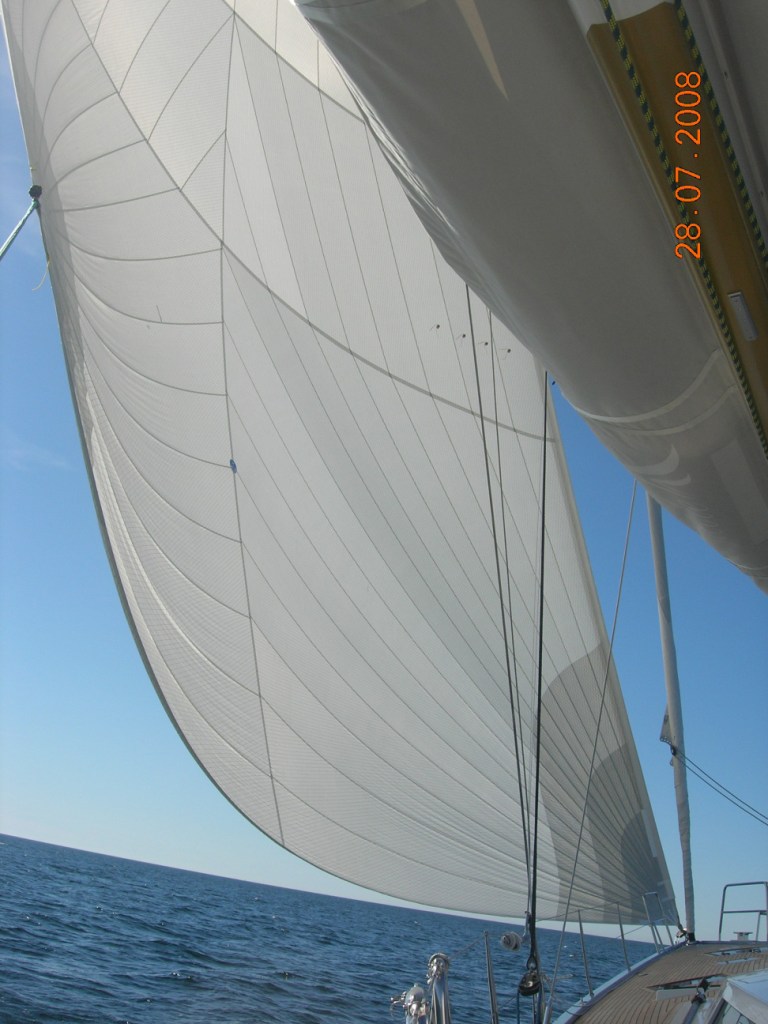 Our first impressions : few small problems couldn't destroy her image. She is a dream! She sails great : with 14-15 knots wind her speed from almost upwind to 140 degrees never falls below 10.5, usually over 11. The engine (Yanmar 110 PS) in small waves kept her speed over 10 without any effort (2400 RPM), we didn't press the engine more. We also tried the code 1 (North sails) for a few hours. Besides pushing the speed up by 2 knots nothing else happened. The pilot handled the sail alone like the self tacker.