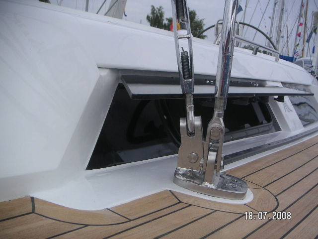 position (angled to the middle) of the halyard stoppers: This is nice if you only use the winches on the roof while having a sprayhood. But it does not work if you want to use the winches at the end of the cockpit. If you only have a selftacker and the mainsail without german sheeting system, the winches at the end of the cockpit will be absoultely useless. On our 370 we always use these winches for the sheets! So this new solution is no good solution.