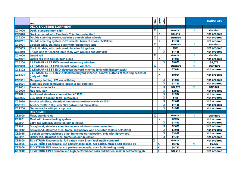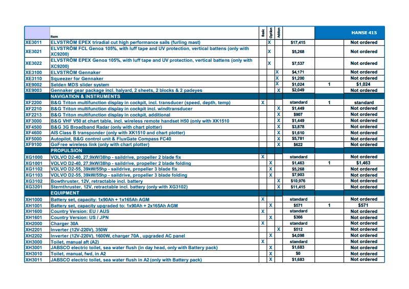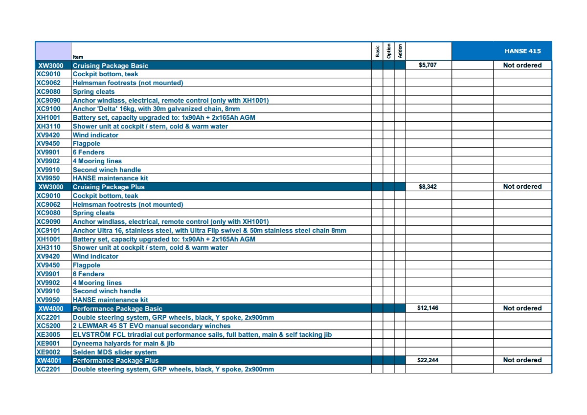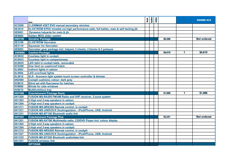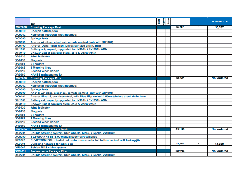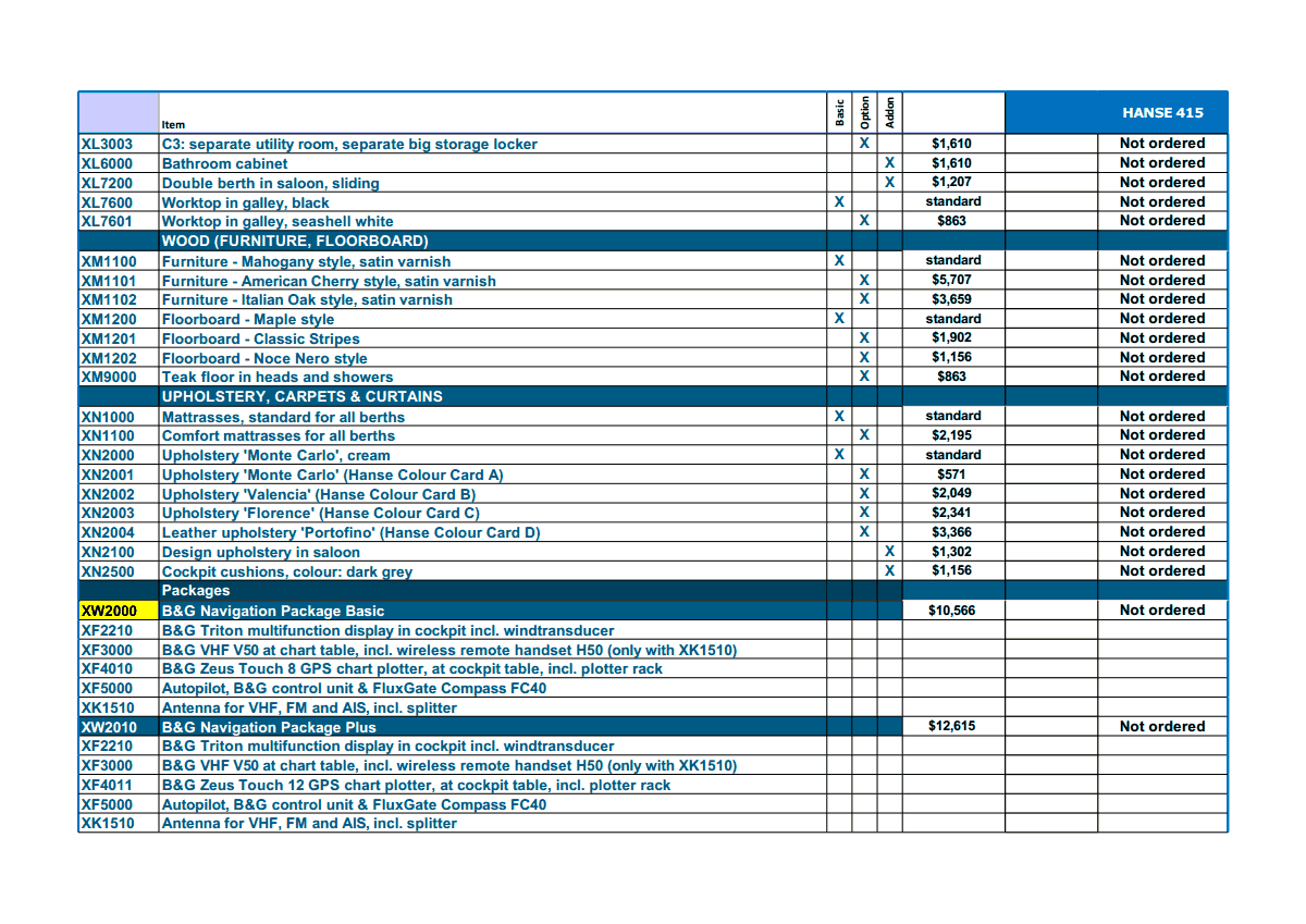 Performance package basic Comfort pack basic Convenience basic Bigger engine Entertainment package basic Airconditioning Teak decks Folding prop