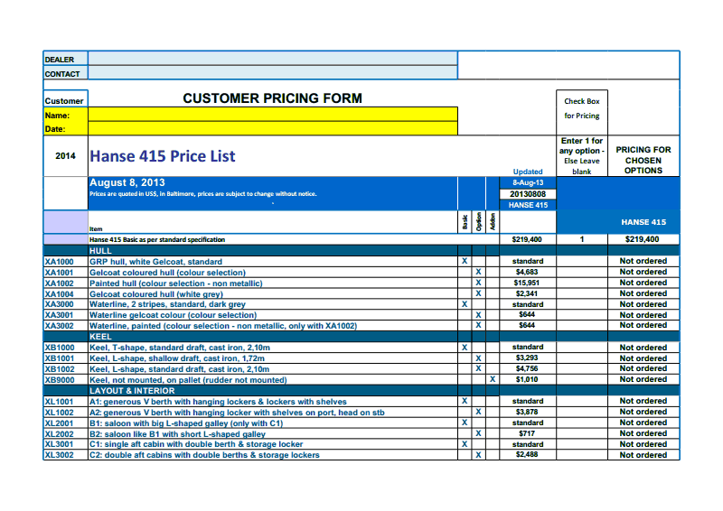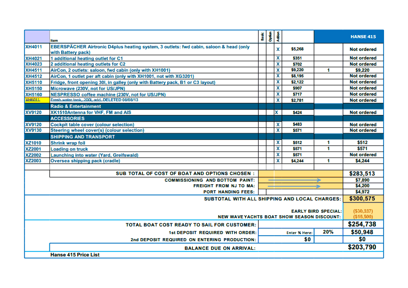 I sent in an options list for a quote, i did not add the inverter but I could later before the final order. I did put the larger engine on there. The total came to 284,084 then with the full early bird discount it goes down to 253,747 I am wondering if they will discount that further, and how much commissioning and bottom paint will cost.