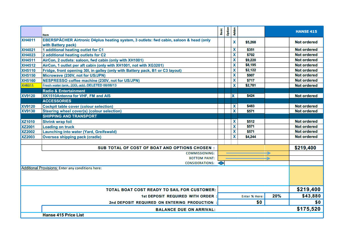 Can you please reconfirm the options you are getting? I added them up and it came to less than 300,575, but maybe I did not add in the commissioning and shipping cost. How much are they charging for commissioning and bottom paint?