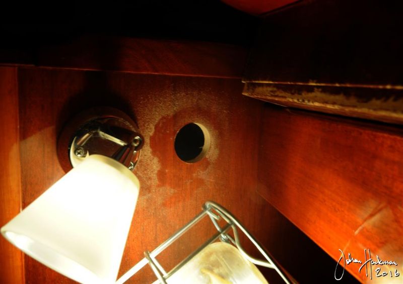 I have one USB socket on each side and I take the electricity from the two reading lamps. The cabinets are built in such a way that there is 50 mm space between the outer wall and the inner one. This can be seen in the below picture where I have drilled the hole, so there is room for the cable and the socket itself. There was no need to drill a hole all the way through into the cabinet.
