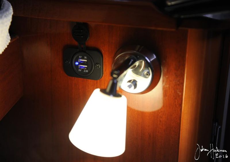 I just measured the idle current of my USB-sockets and it is just 0.01 Amps. I don't think this small current requires separate switches, or do they? If you want to turn them off you turn them off with the same two buttons for the cabin lights (starboard and port) on the switchboard at the chart table.
