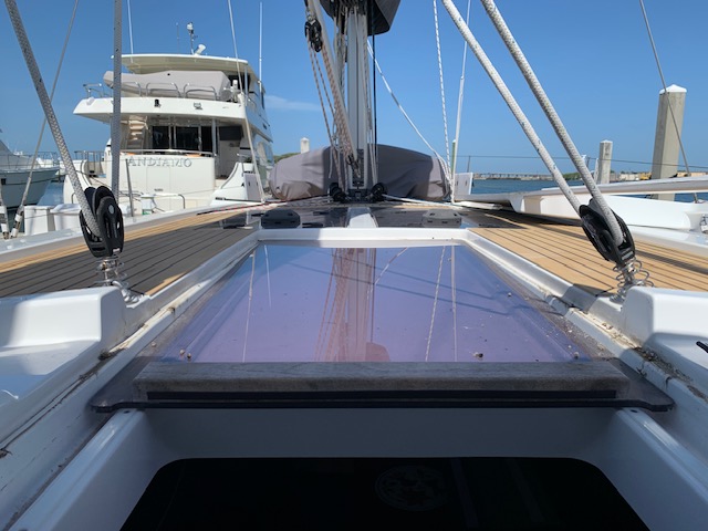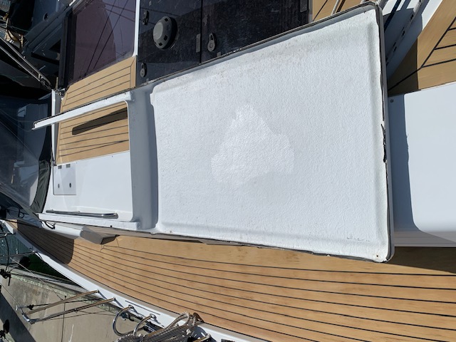 That should be the hatch garage. It’s just a cover for the companionway sliding hatch when it is slid forward. Not sure about the 460, but on the 458, it is held on by several screws and it is a very long piece that has legs that cover the sides of the hatch when it is closed. Underneath it and the hatch itself is just more fiberglass of the coach roof.
