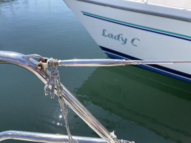 Here are a couple of pictures showing the turnbuckle at the stern and the simple swage at the bow that is fitted to Dragonfly.