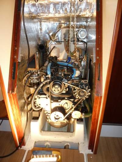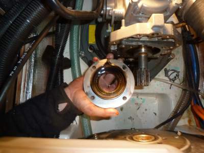 I first removed the ladder and the wood in front of the engine. Then detatched exhaust hose, sea water cooling hose, and hoses for water heater. Remove the bolts fixing the sail drive to the flywheel part of the engine. Then removed engine mount bolt and lifted the engine slightly up using a chain hoist fixed to a wooden piece across the companionway. The engine was now slided 20 cm forward and splitted from the saildrive (used a big screwdriver to help splitting). You have now access to a flat circular plate on the sail drive. Remove that and you will find the oil seal. Since I also will change diaphragms I removed the circular part on the sail drive that is fil to the engine. This gives me a little more space. Then outside on the hull, remove the rubber seal between sail drive and hull. There are 8 bolts to be removed. Then remove bolt inside that fix sail drive to hull. After that you can just lift up the sail drive and change diaphragms.