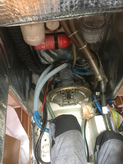 Your quote appears high. Hours should be around 15-20 max and the hourly rate looks high. Although I ended up replacing the whole saildrive unit myself, the engineer I had previously booked for the diaphragm replacement had quoted £1,500 - 1-2 days work for two people. This included engine removal and refit. The exhaust hose and elbow needs to be removed (although I split the exhaust at the water trap and left the short house and elbow attached to the engine as this was easier). You also need to remove and plug the hot water calorifier hoses at the engine end.