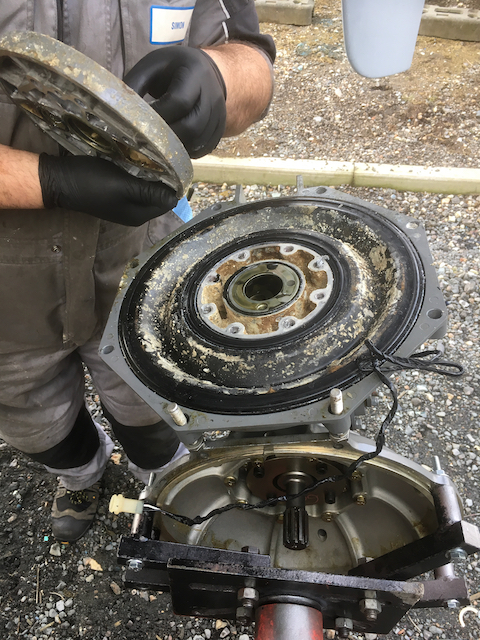 The 4 bolts/nuts that you were backing off when removing the clutch is not the right ones (those only secures the pinion assembly). You need to remove the bolts holding the flywheel cover to the engine. If you want to separate the flywheel cover from the gearbox this is done after the separation from engine, but this is not needed for the diaphragm replacement. I did mine this winter and changed all o-rings and seals + the needle bearings in the clutch. I would also suggest that you check the vertical play of the clutch that you put hours to set up, mine hade increased from 0.2 to 0.4mm since i did the original install of the upgrade kit. Also the gear selector play should be checked, but use Yanmars method and not Guedions since his will give a to big play (should be 0,2-0,4 while he say "back off one turn" that will be to much)