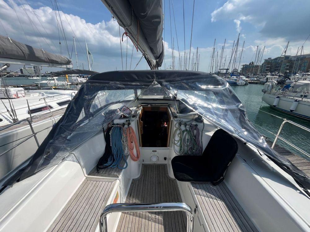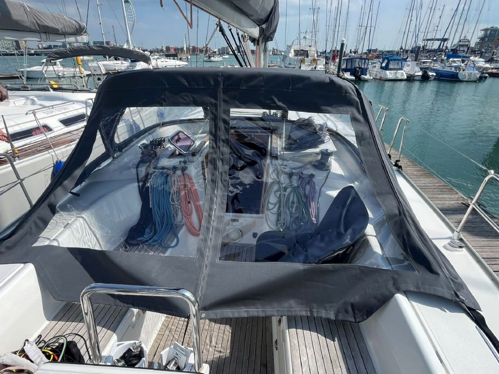 - full length cockpit tent sourced via Elite Yacht Covers in the UK.  They've done similar on other Hanse yachts.  They got the idea of "a tent I can sail with" right away.