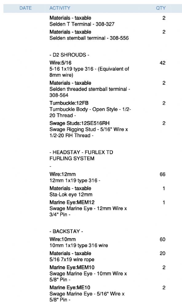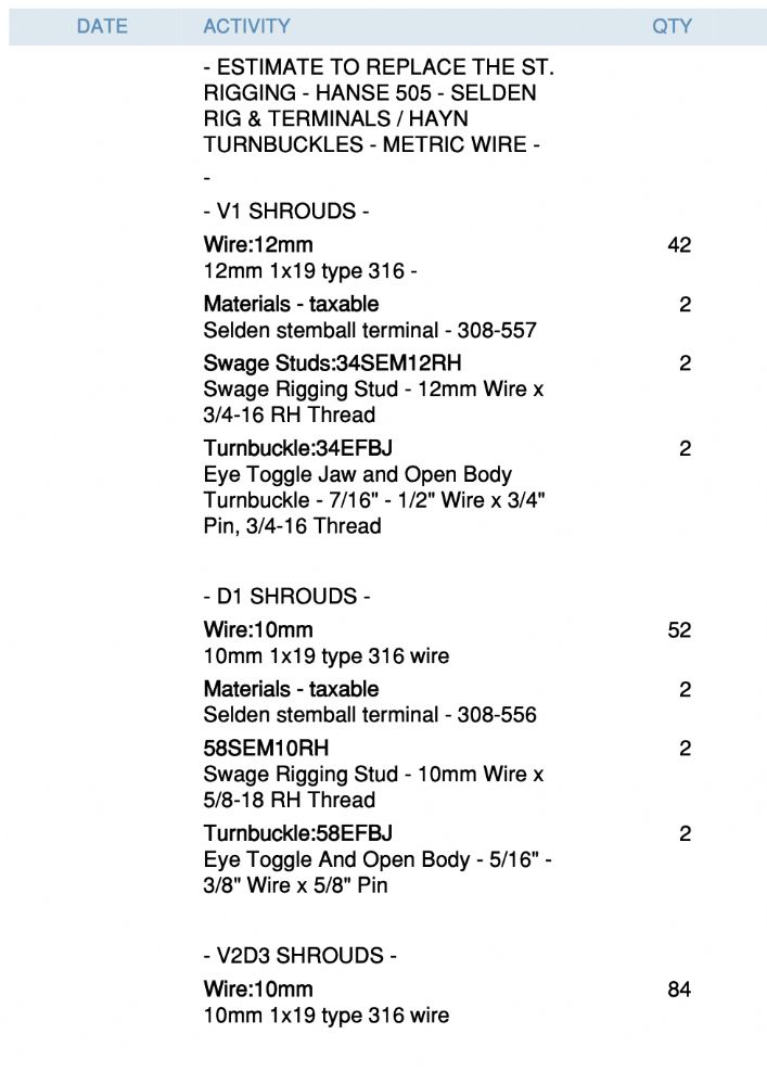 Here is the bill of materials for when we replaced our standing rigging last year. Hope it's helpful.