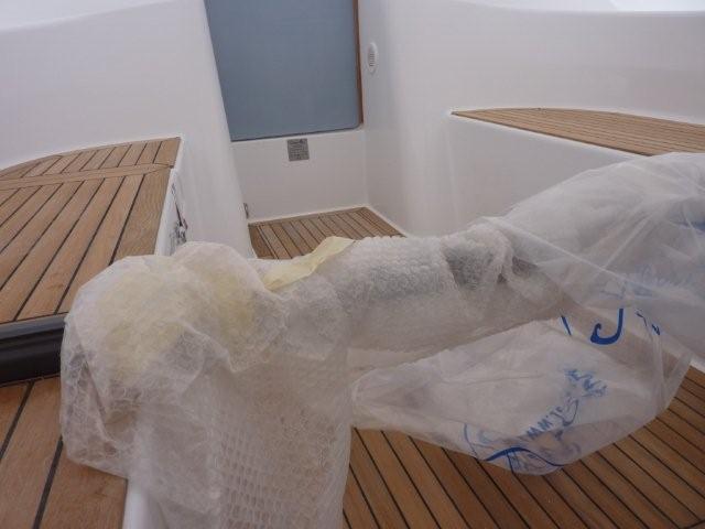 Today the first sight of our new  boot. A bottle Jaigermaister and sit down under the plastic cover. It looks great.