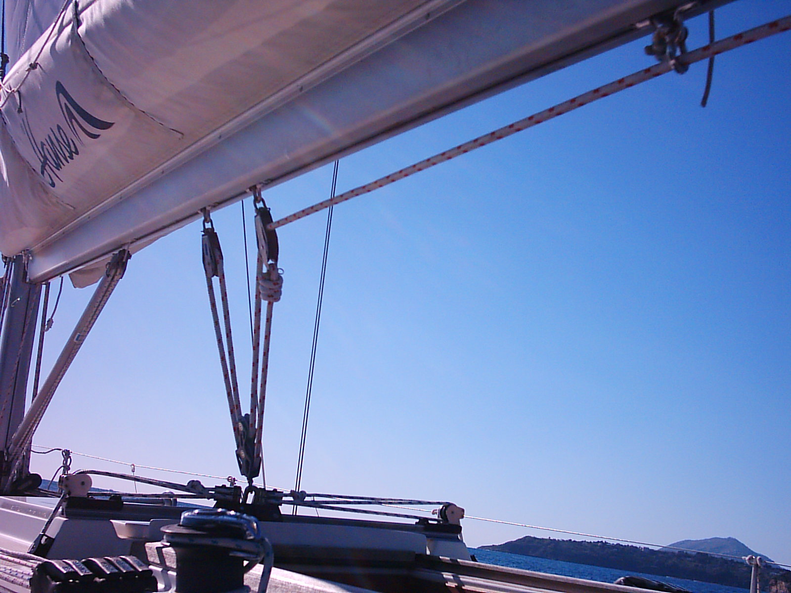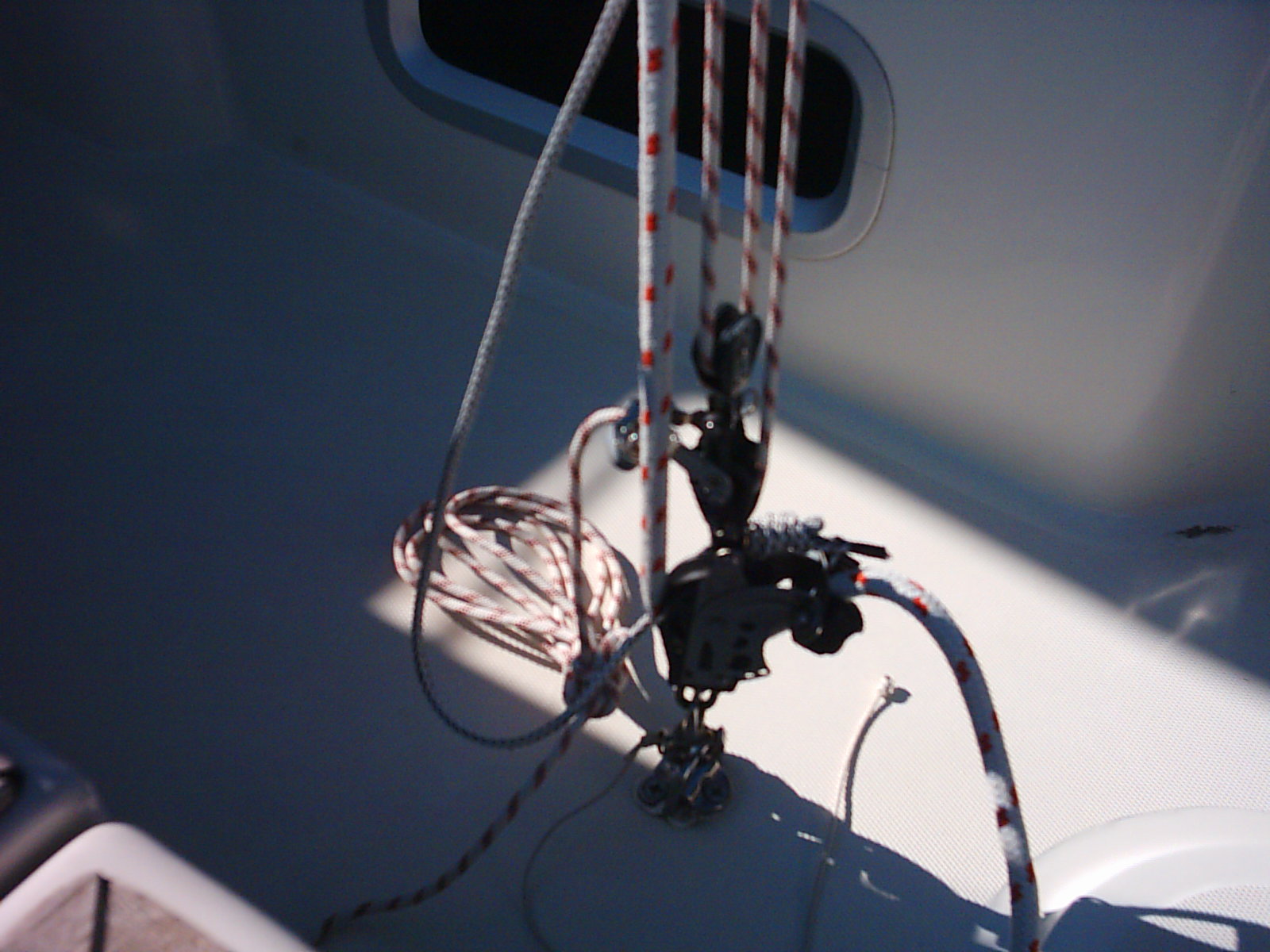 La seconda è che bisogna ricordare che lo sforzo maggiore( però inferiore all'originale) resta sul paranco iniziale ed in totale in basso si scarica non su uno ma su due punti e in alto sul boma in tre punti. Calcolai tutto con le specifiche Harken ed in pratica con la mia randa(34,50, circa , Doyle) il carico massimo sul punto di scotta sviluppato potrebbe essere intorno ai 500,50 Kg. diviso ora con questo sistema per due; nell'originale invece scaricava su un solo punto! Quindi meno carico anche in tuga. Inoltre la demoltiplica che ora diventa a 7 vie rispetto alle quattro originarie più l'aggiunta del paranchino: tutto ciò consente anche ad una donna di gestire la randa con vento forte senza metterla nello strozzatore.