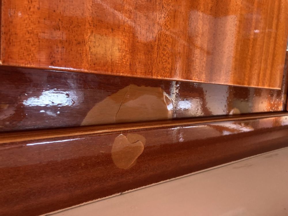 The woodwork in the cabin of my Hanse 311, year 2002, is covered with something that looks like foil. In some places the foil is peeling off or has some bubbles, and I would like help repairing it. What is the best way to do this? Jesper ![]() |
